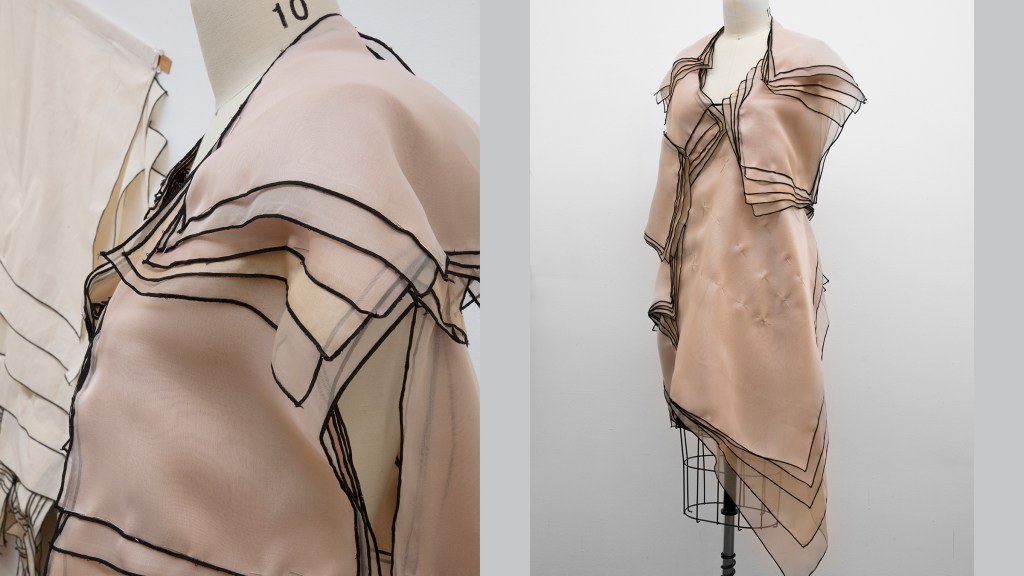 Emotion is driving this zero-waste cut dress. In the shape of a hand, the wearer is poetically wrapped in a dress that attempt to be eco-responsible. Fascinated with handmade work, I was inspired to create a slow-evolving dress that explores the enduring importance of knowledge of handwork.